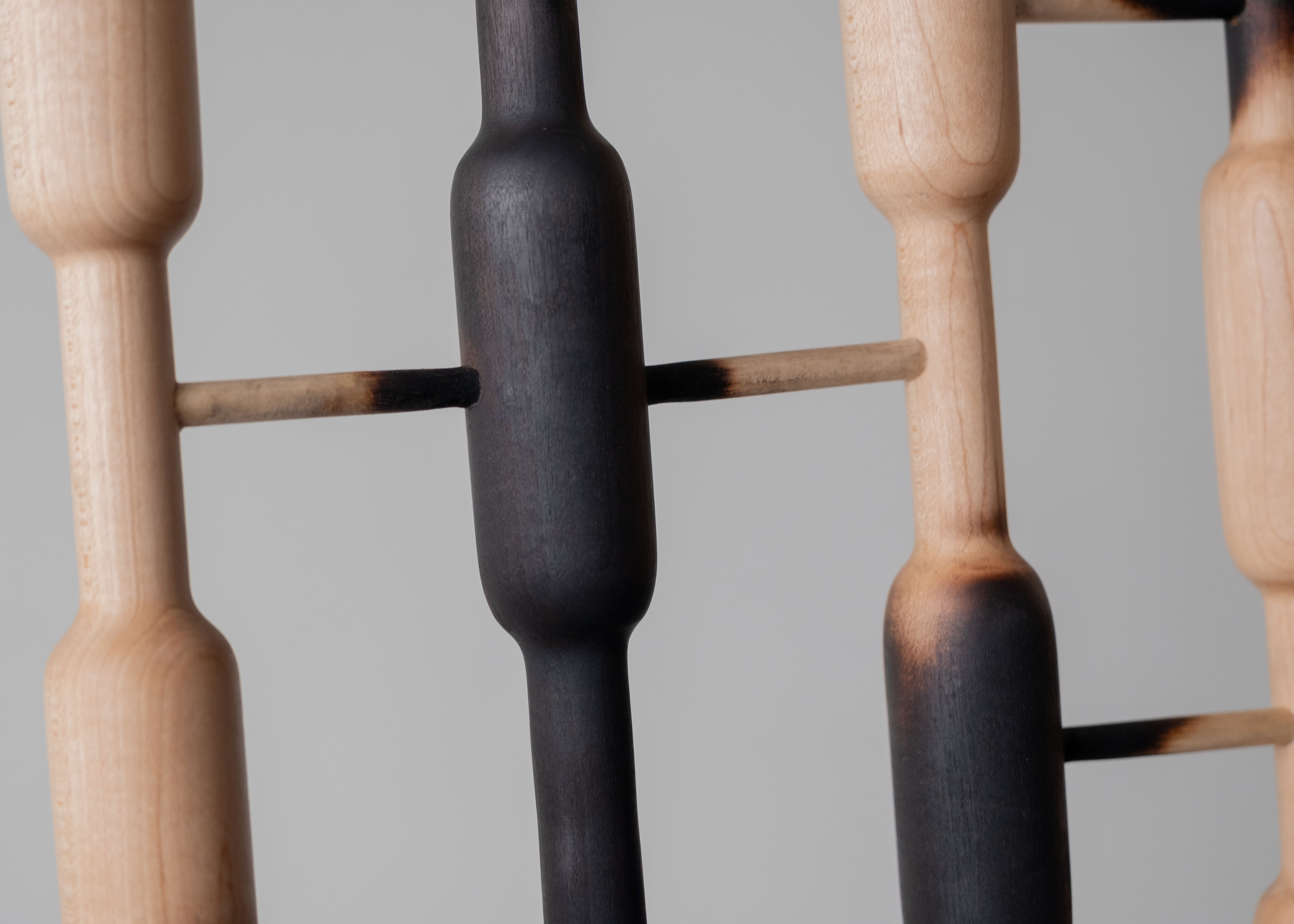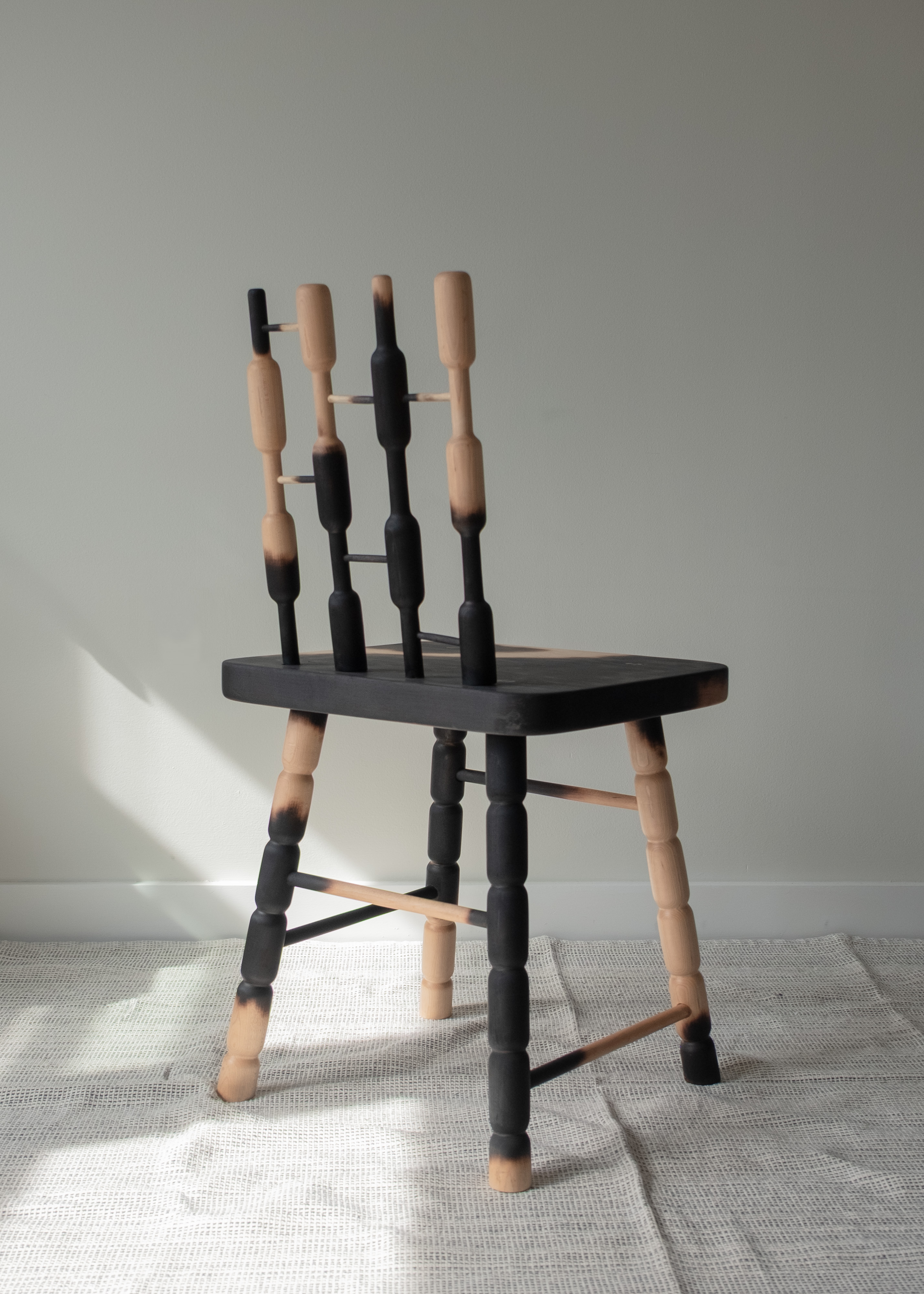 The intuitive burn treatment of wood contrasts the precision of spindle- turning, emphasizing the irregular beauty of hand-crafted work over mechanized uniformity.