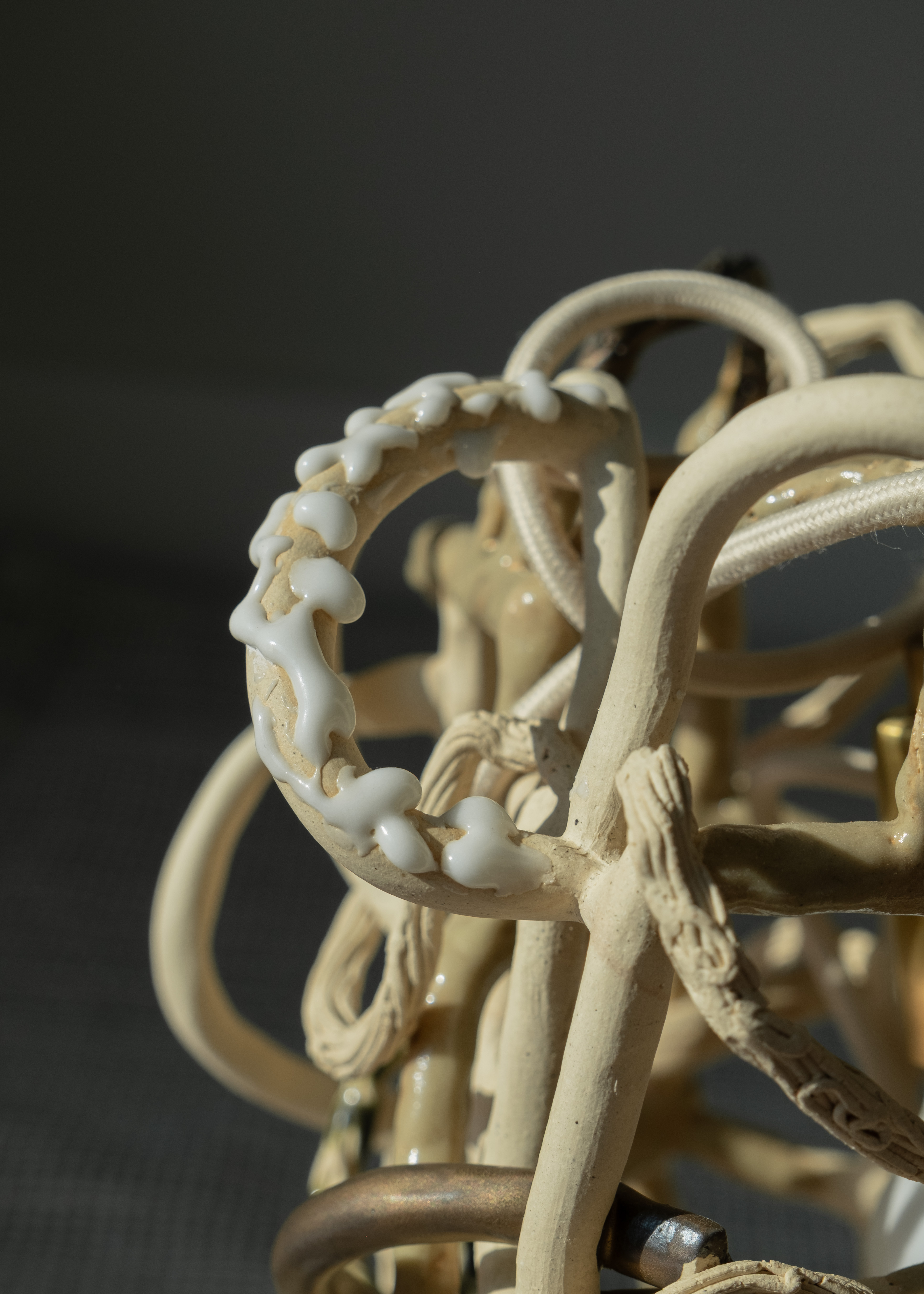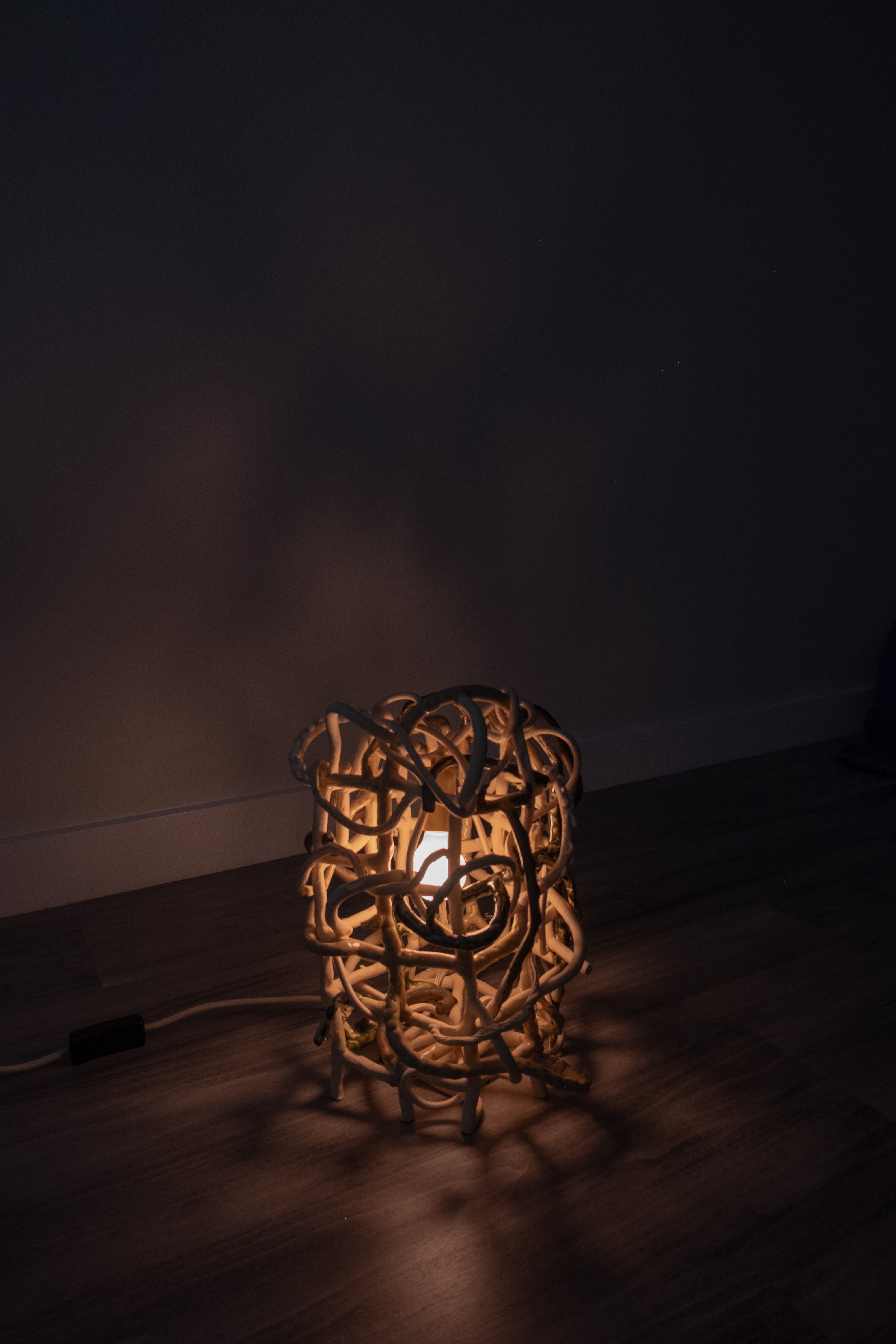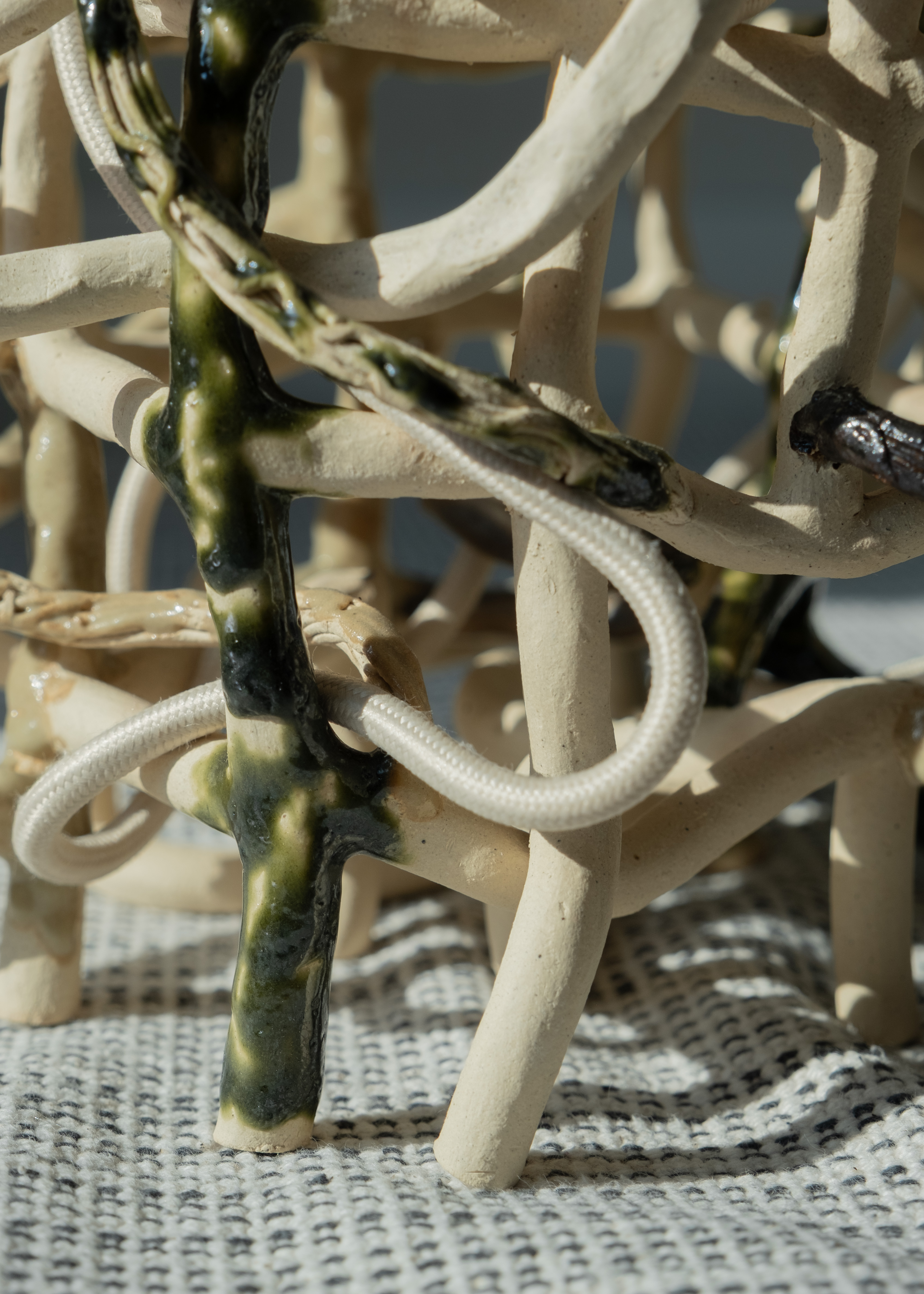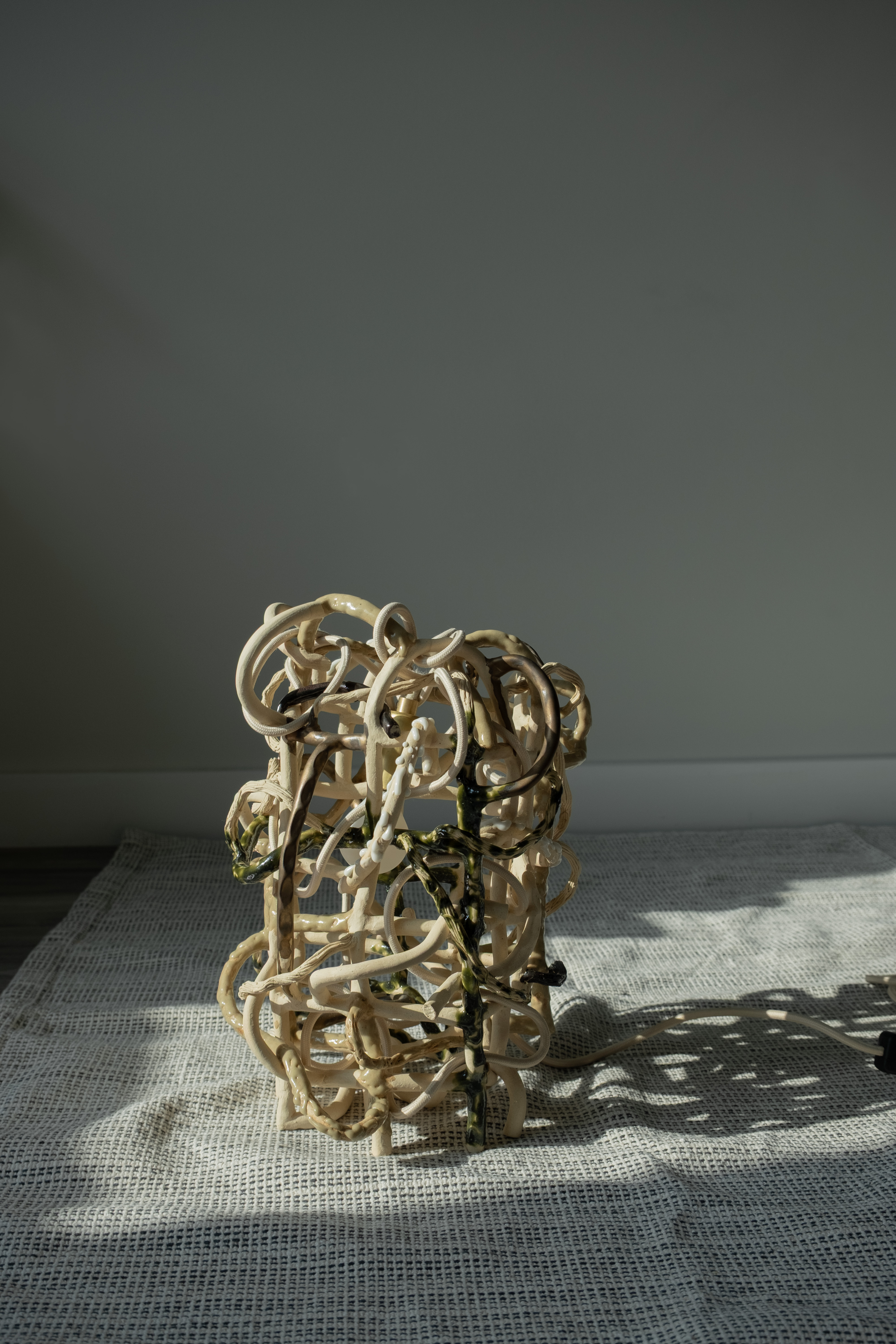 The lamp embodies the sense of non-linear identity by fragmentation of coil form and glaze application. Architectural in its form, the lamp is designed as an abstract jali to house the source of light.