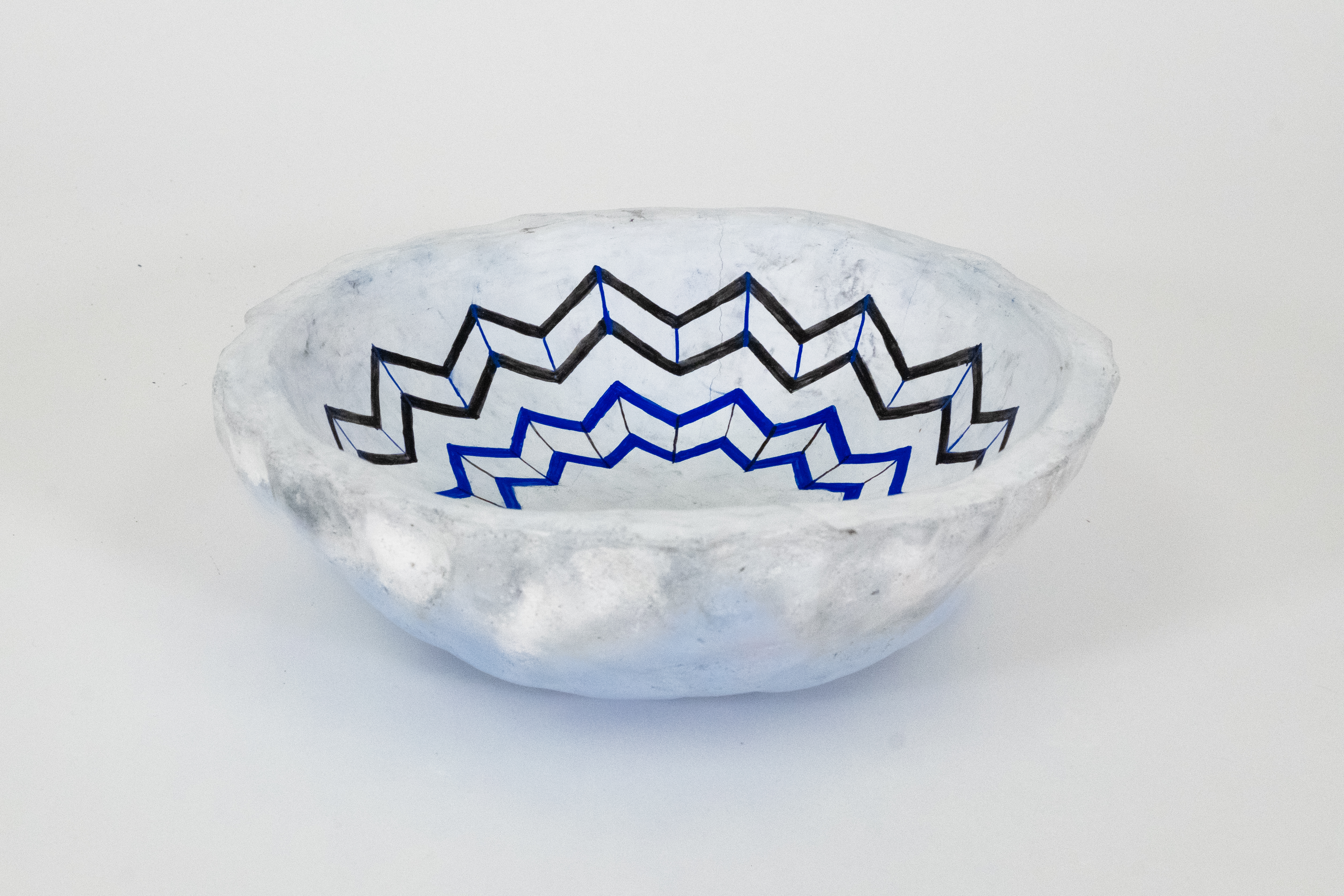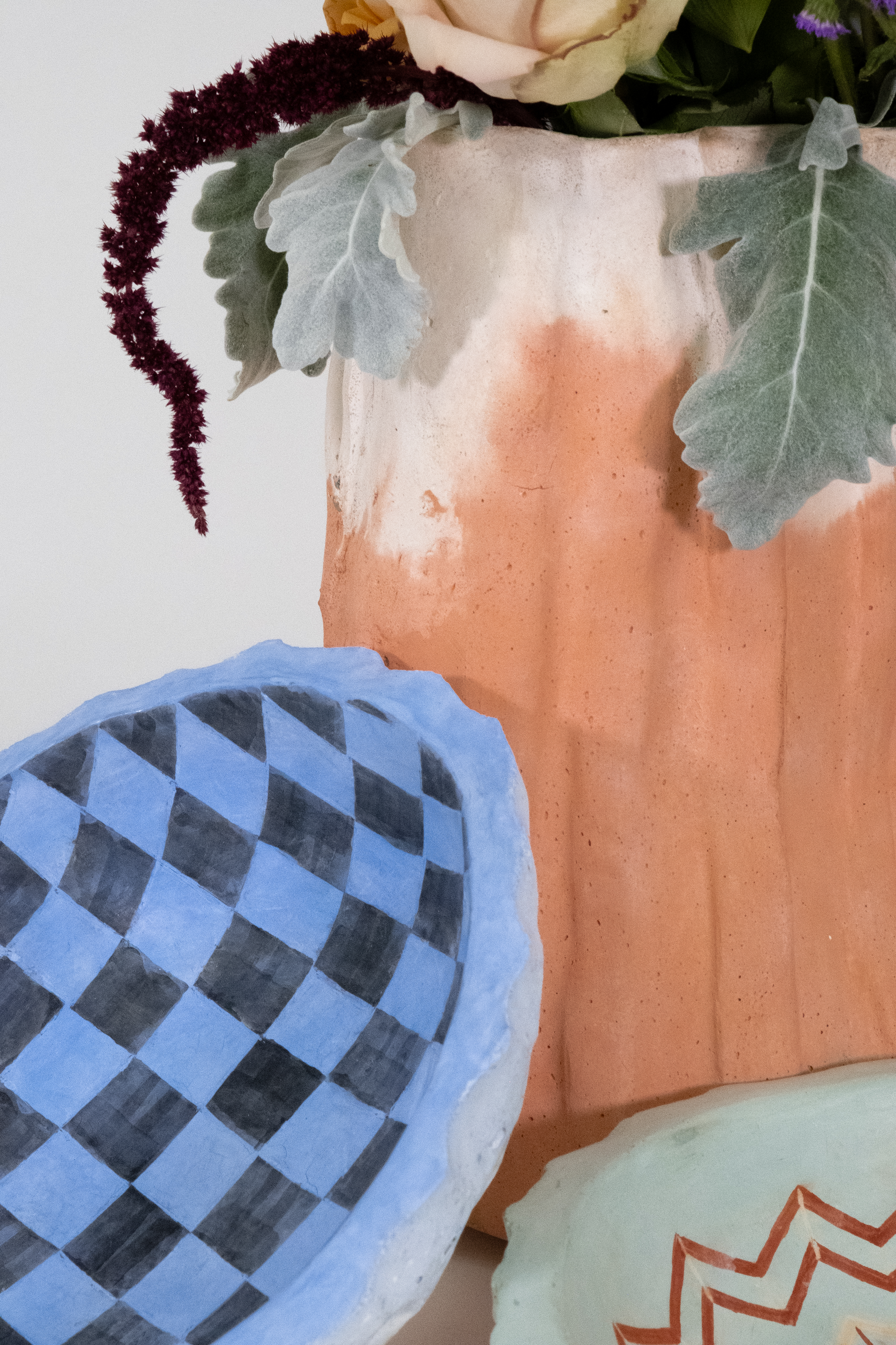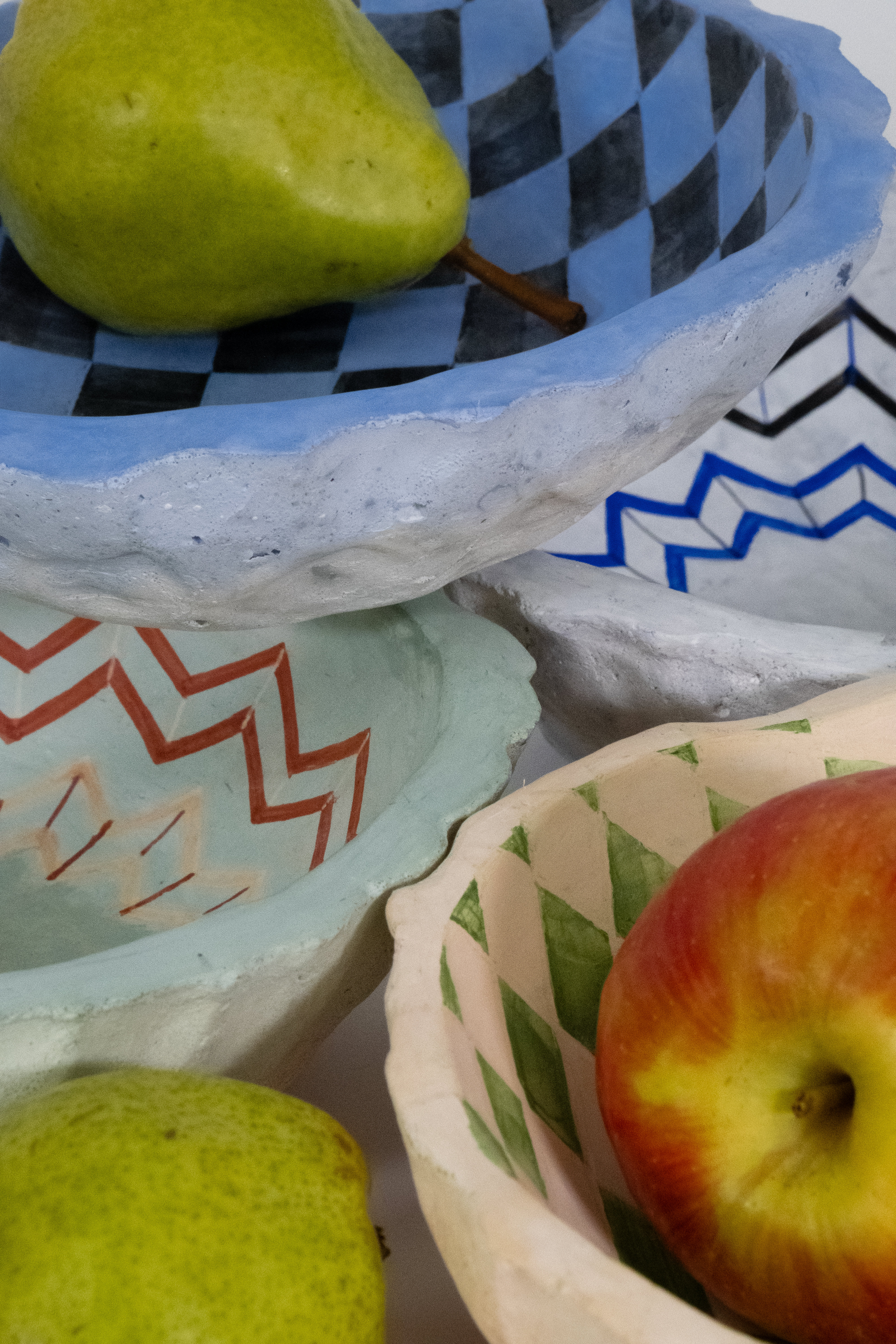 A collection of vessels inspired by the vibrant Rajasthani frescoes of Bundi, India. Handcrafted from lime concrete and lime plaster, these pieces feature some of the geometric patterns derived from the original paintings. Each pattern is meticulously hand-painted using traditional fresco techniques, in which pigments are applied to wet plaster, blending pre-modern craft with contemporary design.