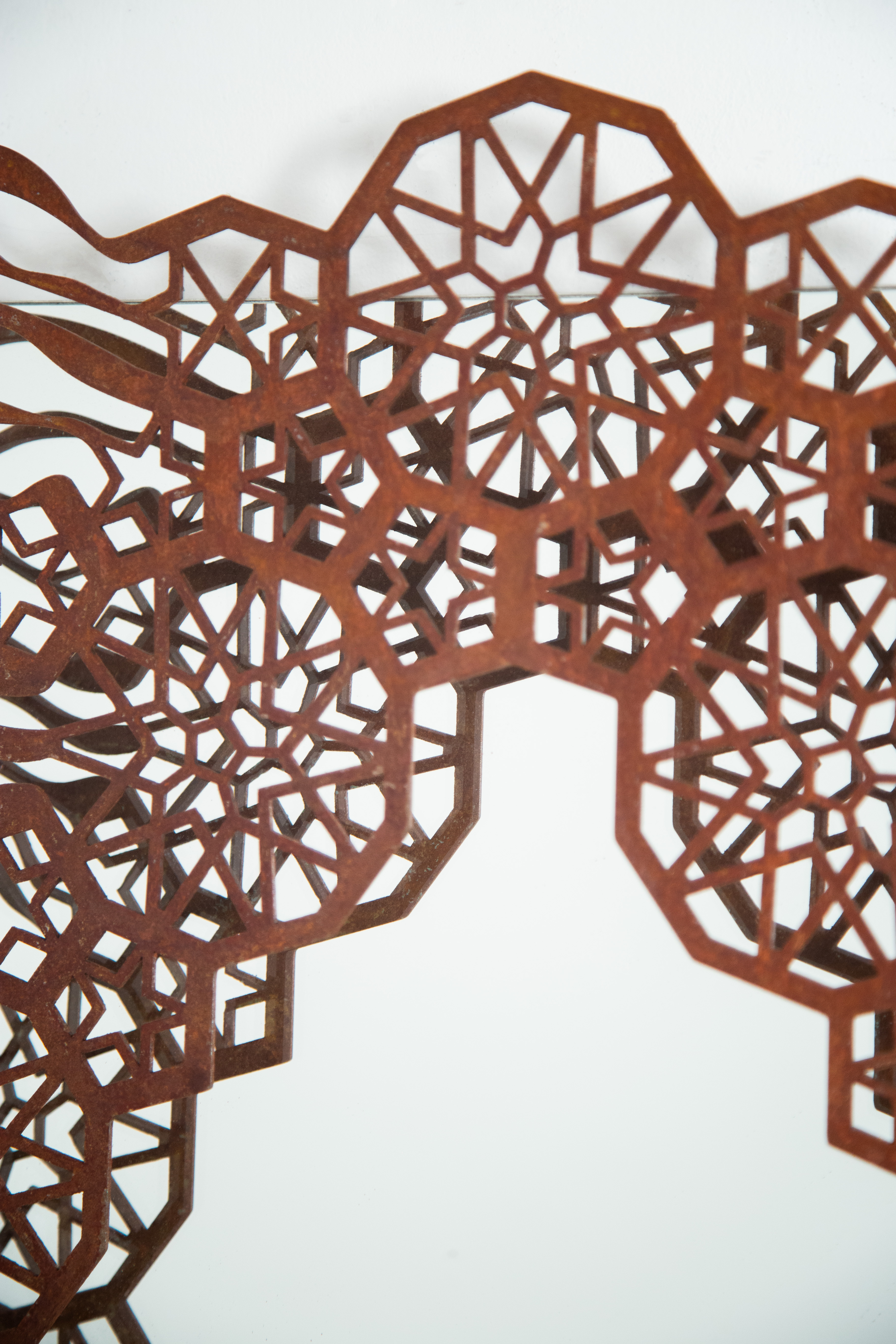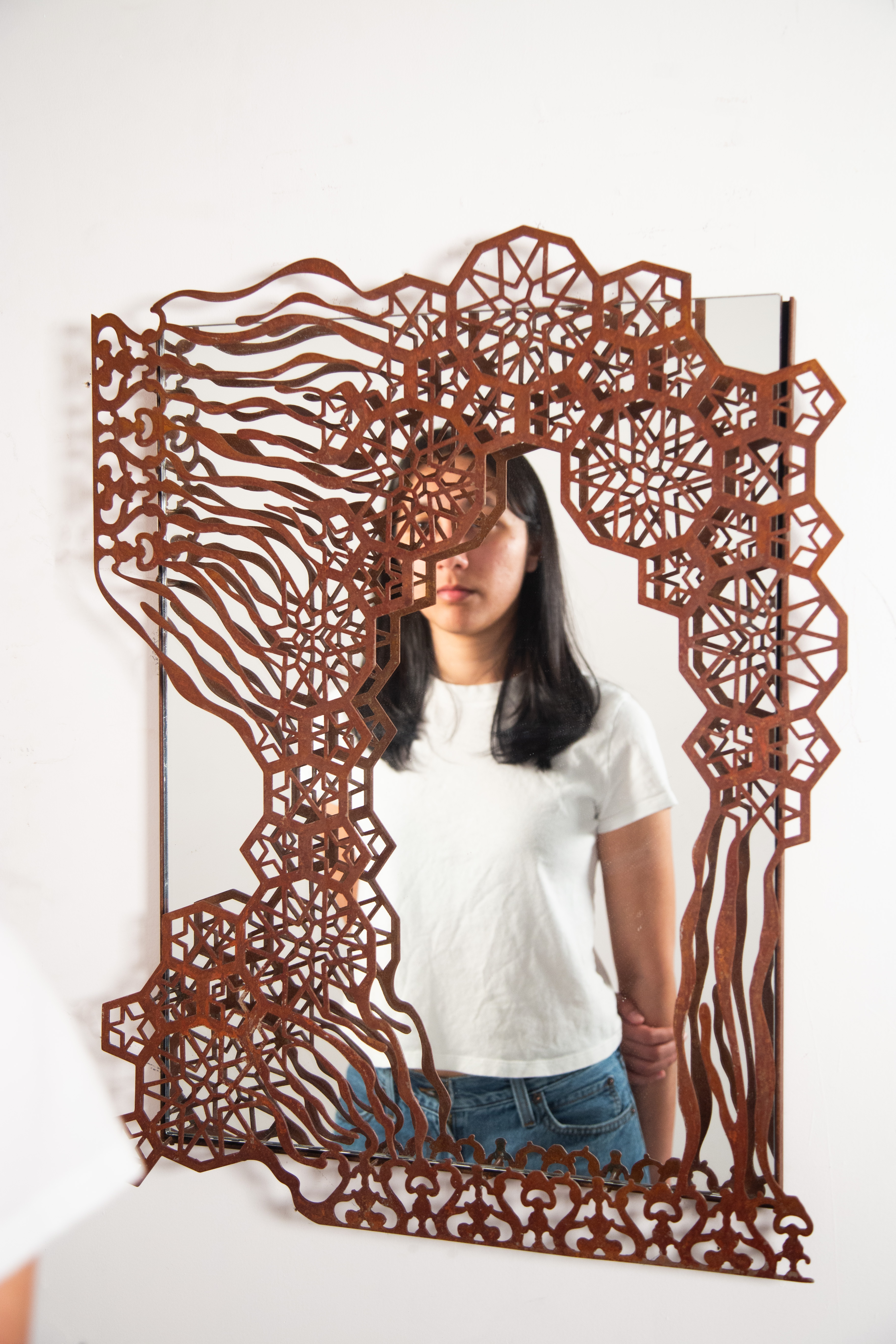 The mirror is an object of self-reflection, literally and symbolically as a meditation on the complexities of identity. Its form fragments ornamental celestial and vegetal jali (Indo-Islamic lattice screens) patterns, interwoven with organic lines that flow between them.
